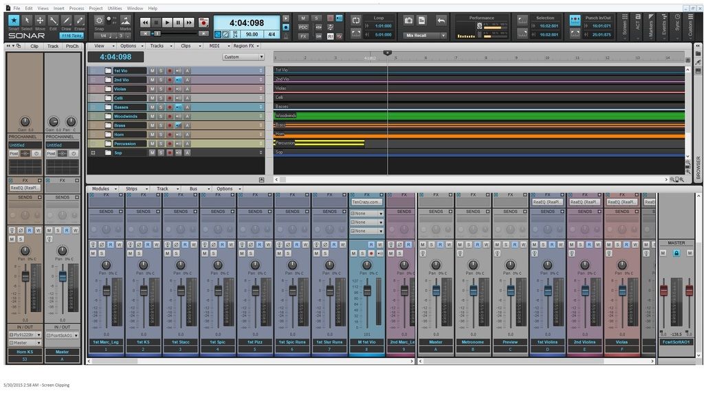 My latest crippling issue is that for some odd reason Sonar refuses to record expression (Ch. 11) data and inserts errant data into tracks arbitrarily. I called support about this, and the tech replied "yeah, that can happen. Don't know why." He advised me to delete the midi track and create a new one, which worked until the issue cropped up again. Now, I can't do anything without some track becoming similarly corrupted. The result is that I have close to zero control over balance, and my violins are launching a spiccatto insurrection against my solo soprano while the bass seems to always be announcing the imminent arrival of Jaws on stage.