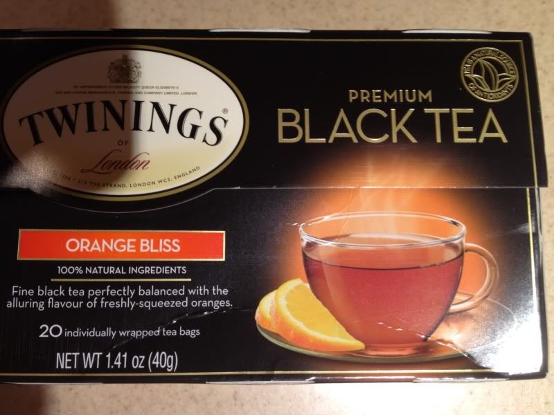 Hot - Bag - Black tea - Orange Bliss - Honey - Tiny splash of cream. Mike EDIT: Both a little off kilter.