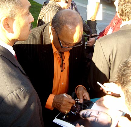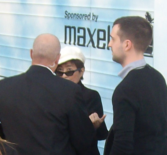 Yoko explaining something to one of her henchmen. Note the geeky dude on the right seems particularly uninterested, with a look on his face like a host who's waiting for a tiresome guest to depart. The next one SHOULD have been a great shot, what with the palm trees and crazed fans reflected in the limo's windows. But at the last moment the alpha goon stepped between me and Yoko.