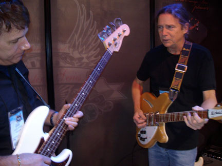 Coolest stompbox at the show. Makes any guitar sound like Roger McGuinn's Rickenbacker 12. Really. And it makes a real Rick12 sound even better. Here's the inventor demonstrating it. Guess what song they're playing.
