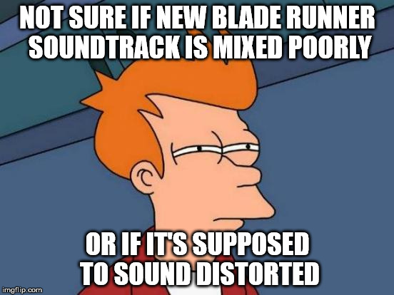 Saw BR2049 this past Sunday evening. Overall, BR2049 is awesome, epic, dark, sad, lonely, and definitely respected the original. Ryan Gosling was great. Joi (Ana de Armas) was adorable. I am a fan of the original masterpiece from 1982. However, perhaps it was because it was a Sunday evening, but there was a total of 8 of us in the theater. That's pretty abysmal. My biggest beef was, and remains to this day, the audio. It sounded like crap! Hans Zimmer, despite his professionalism, experience, and technique really phoned this one in, IMO. Distortion...and lots of it! The theater had the volume cranked a little too loud overall, but HOLY BOTTOM-END, BATMAN! The speakers were over-driven to the point of clipping. Was it on purpose to perhaps be "edgy?" When I heard a character's voice become nastily distorted (i.e. big-time crunch) during a big, low-end part, I knew at that point that "Nope, definitely not on purpose!" So I got on Youtube and listened to a few of the tracks. While none clipped in my headphones as harshly as I heard in the theater, all of them had HUGE, OVERPOWERING BOTTOM-END...so much in fact that I would question everything that is "right" with mixing/mastering. A bottom-end so big, that when analyzed, has energy 60Hz and lower almost up to 0dB. And evvverrrythiiiinnng had bass in the movie. Thankfully no hackneyed bass-drops, but a flying car that weighs maybe 3,000 pounds should, IMO, sound a little zippy or jet-turbine-like and not like a continuous thunderstorm inside the hull of an oil tanker ship! Furthermore, it's super muddy. It was as if Hans used multiple instances of LoAir, RBass on the bass channels, creating that muddy-as-Hell-wobbly-subharmonic-crap while over-driving tape saturation on the Master which affected the mids/highs...including voice-overs, which seem to have been completely ignored during the mix-down to film. I mean, come on! Hans Zimmer is like this big name in everything, right? He even has his own "Master Class" ("...There's a question...oooh, kind of a dodgy question!"). Maybe he gets paid by the plugin? Ridiculous! Overall, the end of my rant will say that the low-end in Blade Runner 2049 is absolutely killing the overall quality of the score in general and definitely killing the sound systems in theaters! Maybe this could be a contributing factor in its poor ticket sales? At this point, I hope the Blu-Ray release will have remastered audio, because IMO, it desperately needs it.