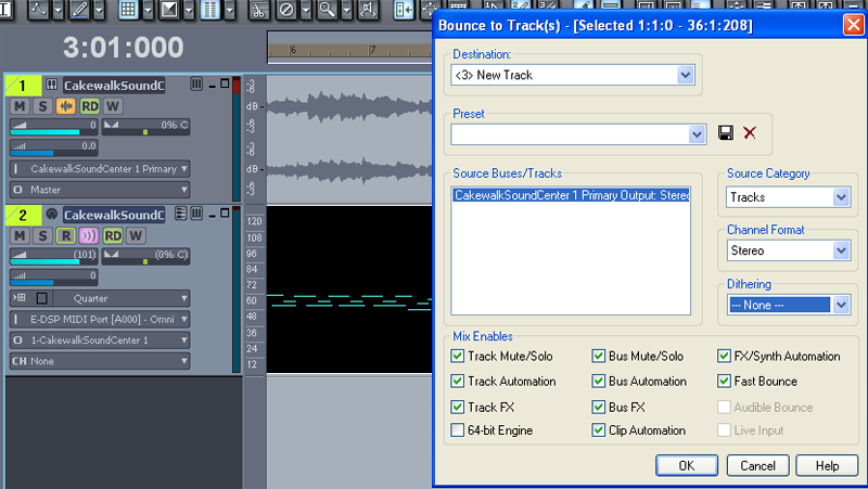 I'm using sonar 8.5 LE and have a question: I have a midi track and a soft synth (sound center) the output of the midi track is sound center and when I play back I hear the midi track played by the soft synth. But when I select the midi track and sound center and hit edit--> bounce to tracks only a flat audio line appear. When play back this audio track you hear nothing. The MIDI parts works, but when I want to bounce it in to audio it doesn't work:( This is strange because when using ezdrummer (instead of soundcenter) it works very well, i get an audio track with the drum beat.. Could someone pleaaaase help me? I've searched the forum multiple times and tried alot (for example: be sure that everthing is selected so I just press ctrl A, and make sure the output for the midi track is the soft synth etc etc i tried it all.) I would reaaaaallllyyy appreciate someone to help me, I must record a song for school but i only have a drum track so far, no piano strings etc.. please help me!