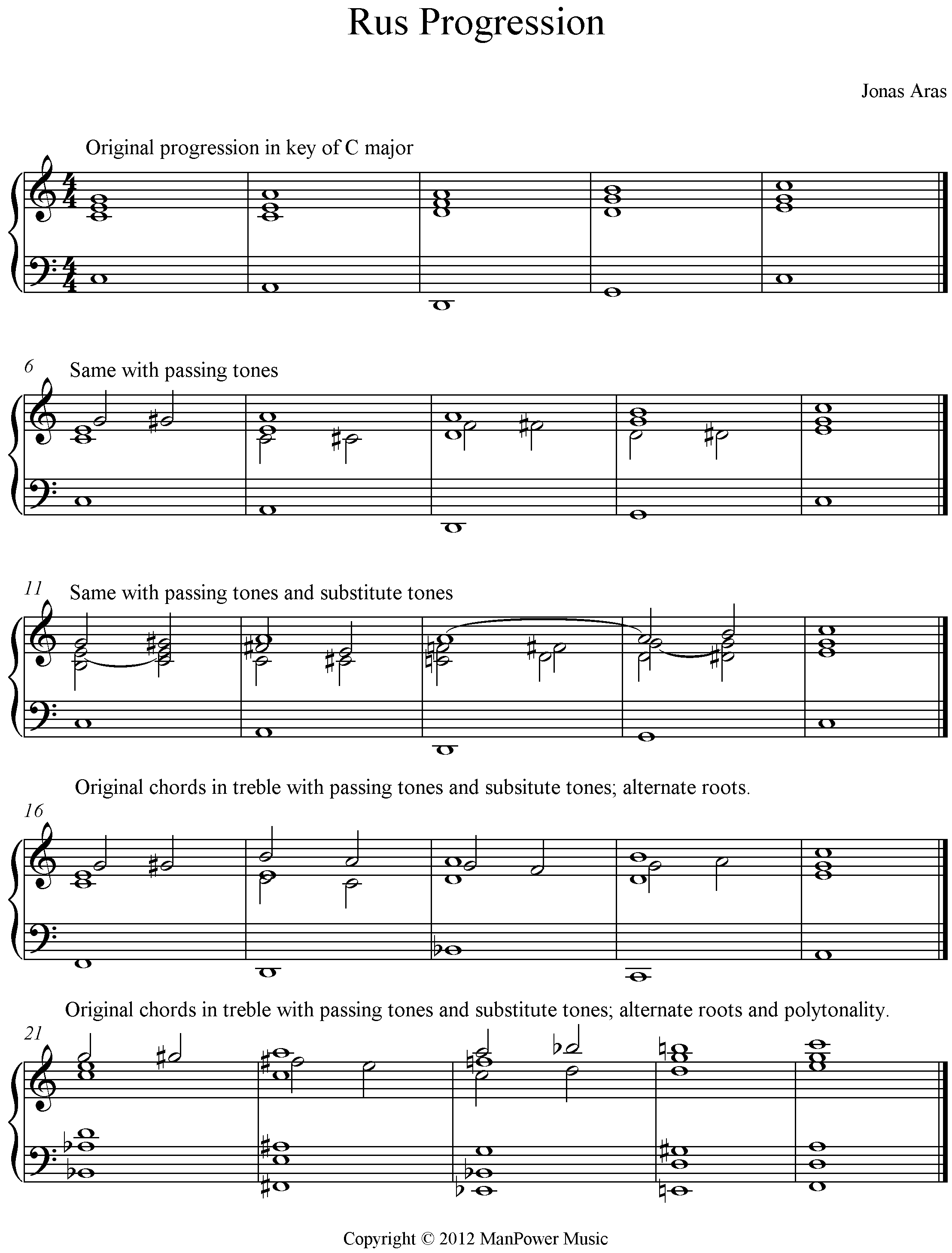 Hi Rus, We're not on the exact "same page" as your progressions are still basically derived from the "gravity" of the circle of fourths/tonal root motion (albeit with added secondary dominants). I'll give concrete examples of leaving that "orbit" and moving away from tonality a bit later. Before we do that, let's start with what you call chord resolutions or what I call substitute tones, which have both resolutions as well as reverse resolutions. Strictly speaking there is no such thing as a Csus2/4 chord as you are using two different substitute tones (D and F) to substitute for a single tone (E). If you drop the C from the treble structure, the D is a "2 for 1" substitute tone and the F is a "4 for 3" substitute tone. This also maintains the integrity of using three-note structures throughout the passage. The motions of substitute tones can also be reversed. At its essence, this is creating nice contrapuntal motion within what would otherwise be static chords. The "fix" that I originally described is what I call a "compensating tone", i.e., I am getting rid of the dissonant b9 interval (it's not a good sound on a C major 7 chord in open position). b9 intervals are easier to create than one may realize and things just sound better when that vertical interval is corrected by moving one of the tones involved by step, which also creates the additional benefit of a little contrapuntal motion. I've taken your original progression in the key of C major and I put it through several permutations which ultimately move out of anything having to do with any tonal center, yet it all sounds perfectly logical. I'll leave it to you to do your own analysis. Now just imagine what progressions are possible if the "original" triadic progression isn't confined to a tonal center, but still voice-lead correctly. MP3 audio: http://bit.ly/QoszU7