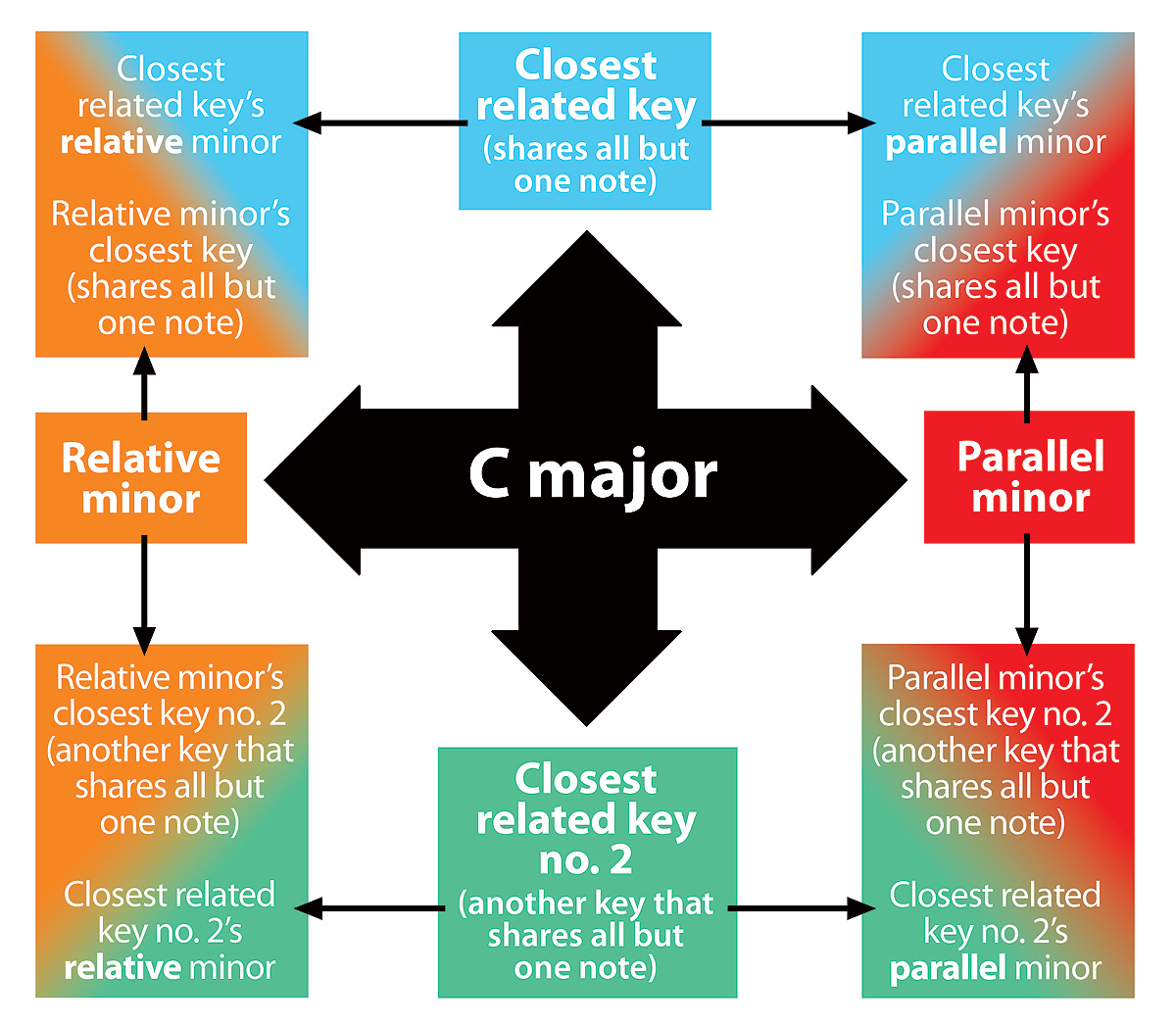 mattplaysguitar Thanks Rus. Learnt some more good music theory there so that's good! I 'think' it's not wanting to switch down to the key of E and it stays in C#m the whole time. I want it to still have some tension on the E because it then builds up and resolves to the C#m, which I definitely want to have a resolve feel. I thinking maybe it's all about timing here. I'm thinking now it needs a C#m resolve before I drop down to E. Then that keeps it in C#m and keeps E feeling tense. If I cut from B straight to E, it feels more like a key change, which I don't think I want. It's also not a pre chorus or anything, just a succession of chords leading up to the chorus in C#m. I thinking I could maybe cut the time of the B in half and put a quick C#m resolve then drop to the E. So instead of | A A | B B | E E | etc|, it would go | A A | B C#m | E E | etd |. That might do it. I'll experiment tonight. Thanks for the great reply! This parallel tonic thing is really helpful (as basic as it is, you got to start somewhere!). Sorry for the hijack, but it's all in theory learning and I think still relevent to the topic! First off, I like how you're giving it, its own identity! Having said this, do not force it to do anything it doesn't want to or what you think it wants to do. It'll tell you. I and everyone else can only merely suggest. So, now you want tension (I could go on all day on this topic, but I won't! Lucky you! lol) I'm going c/p the progression and analyze it again: | C#m | C#m | E | E | F#m | E | A | B | | C#m | C#m | E | E | F#m | E | A | B | (i ... III ... iv-III-VI-VII) The first two chords evoke the Tonic-Parallel/Parallel-Tonic relationship, but it's in both lines: C#m is the tonic-parallel to E Major. F#m is the tonic-parallel to A major. B is the parallel to G# minor. So, I would throw in some of those chords in-between the ones you have written already (Bolded) C#m- A-E-B / F#m-B-C#m / E-B- A-E / F#m- G#m7-C#m That's the easiest way to get the tension while upping the resolutions. Here's something for your E section: E-B-A-E / F#m- G#m-C#m / Bm7-E7-AMaj7-A6 / G#7sus-G#7-C#m See how I temporarily went to E, but kept hints of C# minor before actually going back to it? I embellished them, but they are taken from your original progression. Something else you could do is go to the parallel of your initial key: (C# minor to C# Major in your song's case; the reverse for others - Major to Minor) A classical example, would be Chopin's Fantasie Impromptu: http://www.youtube.com/watch?v=CWBSAcX0Lug (@ 40 bpm - looks extremely slow, but @ tempo, you're killing the piano! lol. Here it is at tempo (Brace yourself): http://www.youtube.com/watch?v=fBA-38mzabs When you hear the F (E#), you are no longer in C# minor. It's temporarily reverts back to C# minor (E natural) (a couple of times) but ultimately ends in C# major. Now, this may seem hard, but it's not. The V in both keys retains the same quality. (G = V in C major and minor; G# = V in C# major and minor, etc.) Going back to the tension/resolution: You can add additional notes, alter notes or alter the additional notes added or evoke substitutions. (That Tonic-Parallel is just one type) I will not evoke this until you're ready. Just make sure you understand the voice-leading dynamic because this is what creates the resolutions. Btw, whomever, didn't understand your "hard transition," I sure you meant wanting to change smoothly instead of abruptly. Though you said your song wasn't modulating, you can still go smoothly from chord to chord in one key. This is referred to as "walking" either up or down from one target chord to another. Here's an example using the tried an true I-iv-ii-V-I: C-Am-Dm-G7-C Instead of Am, I'm going to use C#dim7 because my target chord is Dm. So, I'll walk up instead of leap. CMaj9- C#dim7-Dm-G7-C. The bass notes instead of C-A-D-G-C (leaping by fourths), I have smoother movememt. C-C#-D-G-C. Another example: Em7-A7b9-Dm7-Db7-C. I'm going to sub Eb7 because the Em7 before it is only a halfstep above it while the Dm7 (the target chord) is a halfstep below it. Same with the Db7. Db is in-between C-D or D-C. Em7-Eb7-Dm7-Db7-C. (Notice the chromatic bass line making the progression smoother. E-Eb-D-Db-C) On a guitar using the E and A strings: E: 12-11-10-9-8; A: 7-6-5-4-3 Using your song again: | C#m | C#m | E | E | F#m | E | A | B | | C#m | C#m | E | E | F#m | E | A | B | C#m- A-E-B / F#m-B-C#m / E-B- A-E / F#m- G#m7-C#m (The C#m part) E-B-A-E / F#m- G#m-C#m / Bm7-E7-AMaj7-A6 / G#7sus-G#7-C#m (The E + C#m part, which I'll explain) The first four chords clearly establish E (I-V-IV-I) However, the next three establish C#m via the ii - or in this case - iv-v-i The next phrase has one secondary dominant: Bm7 = iv/iv; added tones - Major sixth and Major seventh degrees while the last phrase is simply a V. However ... what looks like a VI chord is really a IV chord in first inversion. A6 = A-C#-E-F# = F#m7 = F#-A-C#-E. So, in essence, what we really have in the last phrase is this: F#m7 / G#7sus-C#m (iv-V7-i) Remember, I'm only making suggestions, there's no rule that says you have to evoke this. Btw, Matt - and to whoever else - you may want to check out this forum: http://www.ibreathemusic.com/forums/index.php