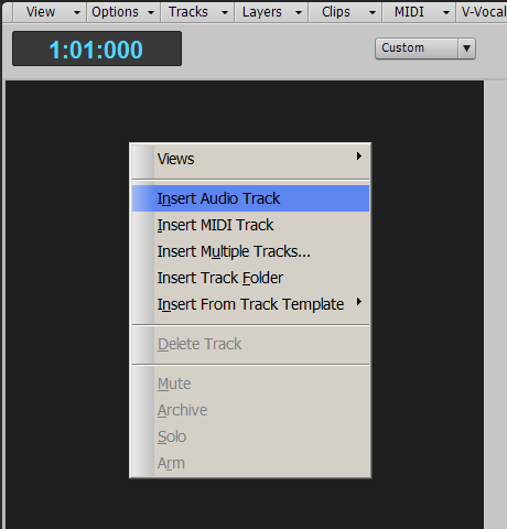 First off, I am going to record the overheads to a stereo track. Admittedly, not the best way perhaps, but stay with me for the moment. In Track View, I right click and select "Insert Audio Track" from the pop up menu.