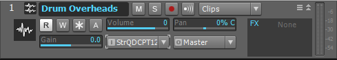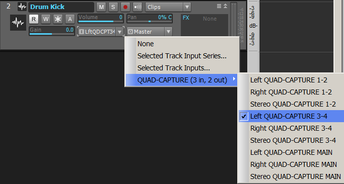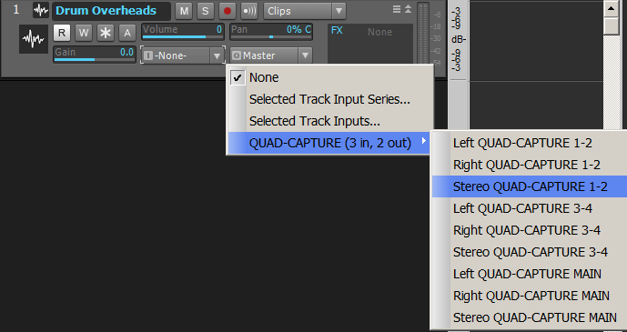 As you can see, Output is set to "Master" by default, and Input is set to "-None-." Also, the little graphic in the top left hand corner, to the right of the track number, shows a crude, single waveform, and this denotes that the audio track is currently a "mono" track. I am now going to change the name of the track to "Drum Overheads" by double clicking on the current name, and then set the Input source to my desired QUAD-CAPTURE inputs by clicking on the down arrow of the Input menu and selecting the "Stereo QUAD-CAPTURE 1-2" input (and the process will be the same for your R16).