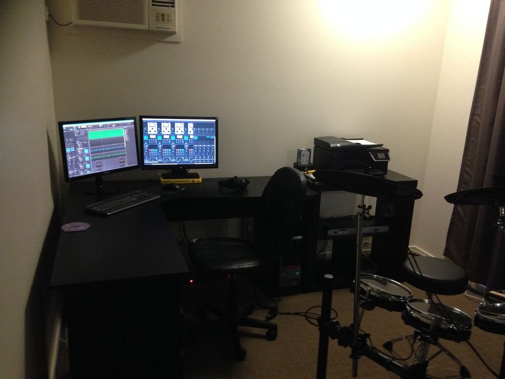 well this is my little space, tried to stitch the first 2 pics together but failed miserably due to my lack of any skills in that department, so there are 2 separate images for each room ( forgive the mess) my main room the drum room anyway that is my refuge from the world and life