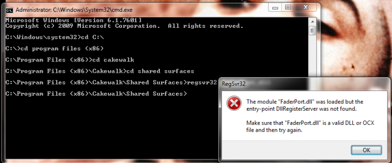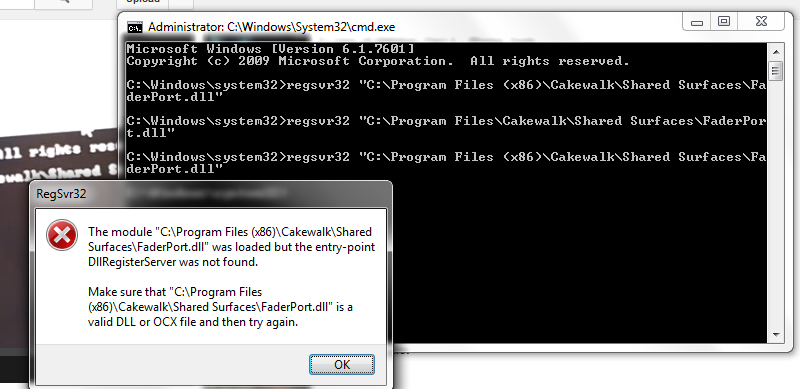 I'm trying to get my Presonus FaderPort to work with Sonar x1 LE. I have found a couple great threads on here about this, but When I try to CMD regsvr32 "c:\Program Files (x86)\Cakewalk\Shared Surfaces\FaderPort.dll" I get this error I tried updating the firmware, didn't help. Does anyone know how to fix this? I'm running Windows 7 64bit service pack 1, thanks