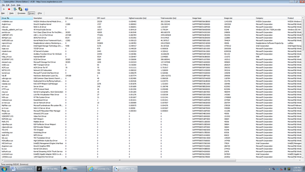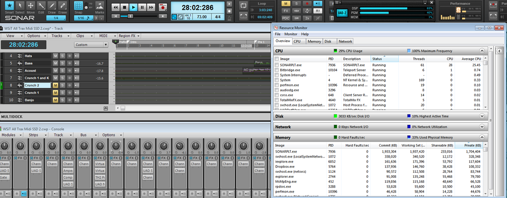 My spec is posted in my signature. Latest drivers for everything. I have a project at 44.1k 16 bit. 64 bit processing off, as it seemed even worse. 30 audio tracks, 1 soft synth with 12 tracks (SSD 4), 12 busses, and all my usual plugs. Here's a pic of the Sonar CPU/cores and the resource monitor, as well as UAD, which isn't near topping out. If I don't set latency to 2048, project will not run. Is there a CPU percentage that you can kind of figure this will tend to rear it's head?