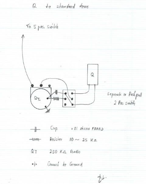 spacey check this out, if you don't know about it already..... Bill Lawrence "Q" filter http://www.wildepickups.com/Q-filter.htmlBill's current filter is an LCR network, sized as a 1" cube, and can be a helpful device for multi-sound capabilities. It is an item Bill has promoted as a player and a designer since the 60's, and he's most famous for using it in the guitar he designed for Gibson back in the 70's -- the L6S. It can simply take the place of the capacitor at the tone control or wired to a push-pull or on-off switch to maintain the standard tone control position while switching to the "Q-Tone". this is how i have my white strat wired