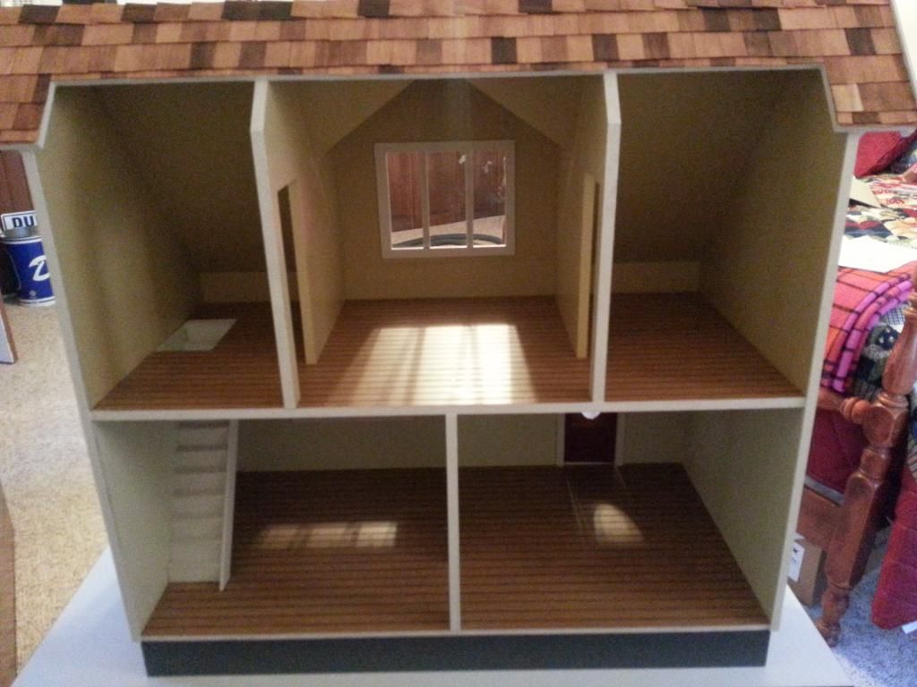 Thanks for the comments on this unique build. As I progressed through the process, I discovered that there is a whole world of things built and designed for these doll houses. Obviously, the furniture to outfit the rooms.... and I suspect that those are also available in kit form. Craig mentioned plumbing and electricity.... Don't know about the plumbing, but yes, they do make electrical lights and such for these houses. Wire is in the form of thin tape. LED lights and it all runs off batteries. They have wall paper specially designed for the smaller scale as well as an entire range of textured paints (simulate stucco) and floor coverings. Sorry, that's a bit too much for this builder. Latex paint left over from my own painting projects is what I used. The front door is actually the same paint and color as my own house's front door. The blue on the siding is some outrageous blue sample my wife picked up for a project which I simply added white latex paint into to calm it down closer to a Carolina blue as opposed to royal blue. If you are a real glutton for punishment, there is always the dreaded crown molding and baseboard molding that can also be applied to the rooms. Bristol_Jonesey: My mother in law picked this kit up at Hobby Lobby on sale for $50. The website for the company lists it for much more.....IIRC $199 as a kit and $299 assembled. The fact that the majority of it was factory precision cut made a huge difference. The roof, especially not only had angled cuts but some of them were also mitered at other than 90 degrees to fit together with no gaps where the roof angle changes and intersect. The only parts I had to custom cut were the roof edge trim. Easily done with a bare hand held hacksaw blade and / or a sharp razor box cutter. Shingles were cut with the box cutter. I spent about $10 on some Weldwood glue for the shingles and used some white glue my wife had for the rest of the assembly. I was surprised the white glue held so well. Blue painters tape as a vice to hold the parts until the glue set up...and only one thing I glued broke. I dropped the stairs and it popped apart at the glue joint. All that's left is to finish cleaning up the room, put the tables back where they came from and store the paint again.
