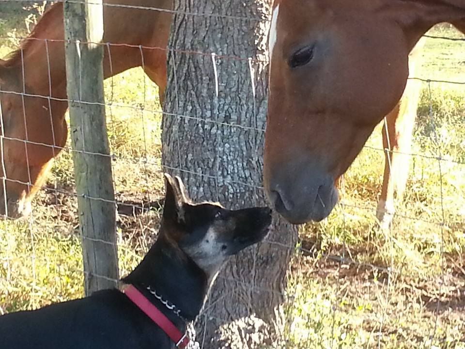 OK... I'm back and wow!!! What a weekend of training. We had 18 people.... close to a dozen handlers and 17 dogs. 90 acres of farmland near Hilton Head.... the military base canceled on us just 72 hrs before we were supposed to be there but our team had a backup plan ready and everything worked out well. We had a simulated crime scene in a grove near a swamp with 6 sources. Some were close together. All were hidden from sight. She had found the first few and managed to submerge herself.... oh yes, quite literally... in the swamp in the process. I was discussing the most recent one with one of the handlers working with us. In the process, we were totally ignoring Lilly and what she was doing. At first, she was simply circling around us, but then she wandered off and out into the edge of the field a bit. I was about to recall her when the other handler working with us, and watching the dog silently, informed us that she had just found another source about 70 feet away and she was "right on it". Yeah, that was a great confidence boost and one of the handlers made the comment that this was the best he had seen her do to this point. She made quick work of the grove and found all the sources, got wet in the process and had a good time doing it all. I don't have pics of her working. But here's one of her meeting a horse for the first time.