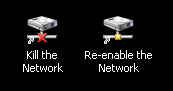 If you use Vista and you just want a shortcut icon to turn ON/OFF your network you can do this : Click Start, Select Network, Select Network and Sharing Center, Under TASK select Manage Network Connections, you will see an icon for your Network connection, all you have to do is either "Drag and drop that icon onto your desktop" or "Right Click over the icon and select to create the shortcut, it want allow you to create the same shortcut there so it ask to add it to the desktop, just select yes. When you double click on that icon on your desktop it will give you the menu with the selection "Disable" to disable your network. When you want to turn your network back on just click on the short cut you created again to enable it. You can also drag that Short Cut Icon to the quick launch bar on the bottom left if you just want to single click it instead of having to double click it on the desktop. "If you ever have any problems, which I never have had, you can always Start/Network/Network and Sharing Center and select Diagnose and Repair", or just right click and select Diagnose and repair on the network connection icon on the bottom right of your screen "The two monitors symbol". You can also just click on the Shortcut Icon you created and run diagnose from there. You can probably do this in XP or Windows 7 in a similar way, I haven't used XP in a while so I can't remember the menu selections, I would think Windows 7 would be similiar to Vista, I've only used their Beta version of 7 and that's been a while back so I can't remember. If your computer has a lot of memory and processor power you may not even need to turn off the network connection or see any difference in performance. A lot of this stuff has to do with automation IMO, I have my computer take care of things at a time when I don't use it, so there's very little accessing my connection, and when it's done it turns itself off. Bobby