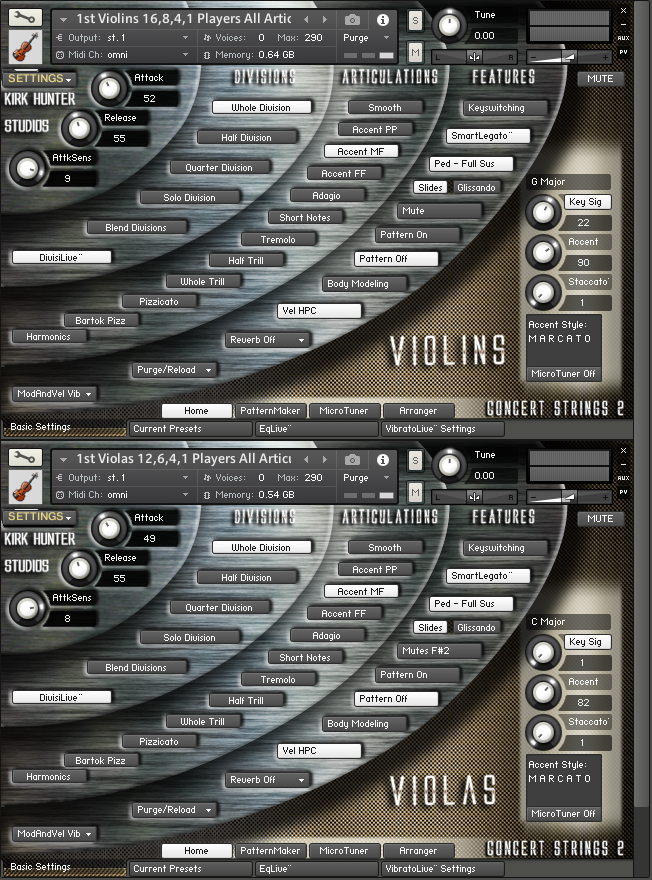 Sycraft Sure. As I'm wont to do, this is an old videogame MIDI file, so not at all composed for any of these string libraries. I adjusted the attack style and such to taste, but little other than that. I've got a CS2 version and a FS and LS version of CS3. In both cases the 1st violins and violas are loaded together in a Kontakt instrument. I've posted screenshots to show you settings, though you can't see everything in CS3 since the interface is so huge and Kontakt won't scale up any more. In CS2 I set DivisiLive on, Accent MF style with Marcato accents and reverb off. In CS3 I set it to Marcato articulation, turned loosen entrances down to 6, set it for "bone dry" and turned the violas section down to 12 players to match CS2. As far as I know the auto divisi is always on in CS3. All of them are playing through a QL Spaces reverb so they all have the same verb on them (all set at the same level). Files were produced just be switching the output and bouncing the tracks again, then I cut off some leading silence and normalized them in Sound Forge. No additional processing. There is a bit of apparent level difference since this was just a peak normalize, not something to try and balance apparent volume. Concert Strings 2 (settings) Concert Strings 3 Full Samples (settings) Concert Strings 3 Lite Samples (settings) Should give you a rough idea of the sound differences. You'd probably want someone who's an actual composer to do a better demo, but this should help you hear basic differences, and isn't biased towards any of them by virtue of being tracked for generic strings libraries. As others noted, CS3 can hit the CPU pretty hard. I don't think Kontakt threads out its scripts as well as it could because it'll hit one core more than the others. With the big CS3 multi and some pretty crazy input, I was seeing spikes near 100% on a core. Never went in to the red that I saw, but close, and I'm running on a i7-5930K at 4GHz off of SSDs so this is a pretty heavy hitting computer. Something else to make note of if you want to use the big multi is maybe turn down the number of basses and cellos. The thing ships with 16 chairs of basses which gets a bit overwhelming in most mixes. Maybe knock it down to 8 or 6 to start.