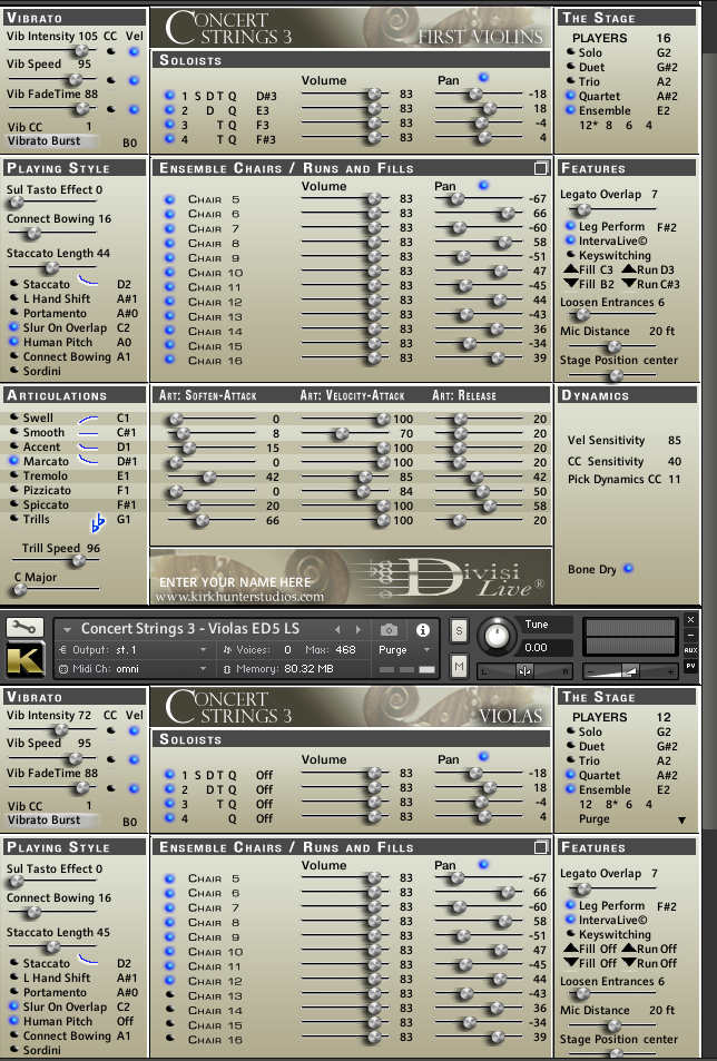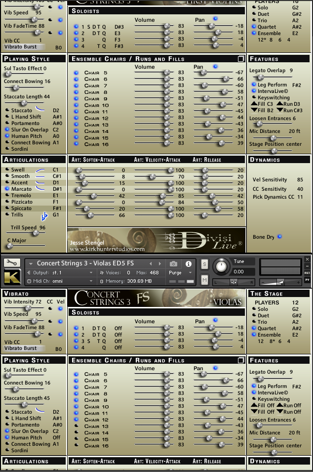 Sure. As I'm wont to do, this is an old videogame MIDI file, so not at all composed for any of these string libraries. I adjusted the attack style and such to taste, but little other than that. I've got a CS2 version and a FS and LS version of CS3. In both cases the 1st violins and violas are loaded together in a Kontakt instrument. I've posted screenshots to show you settings, though you can't see everything in CS3 since the interface is so huge and Kontakt won't scale up any more. In CS2 I set DivisiLive on, Accent MF style with Marcato accents and reverb off. In CS3 I set it to Marcato articulation, turned loosen entrances down to 6, set it for "bone dry" and turned the violas section down to 12 players to match CS2. As far as I know the auto divisi is always on in CS3. All of them are playing through a QL Spaces reverb so they all have the same verb on them (all set at the same level). Files were produced just be switching the output and bouncing the tracks again, then I cut off some leading silence and normalized them in Sound Forge. No additional processing. There is a bit of apparent level difference since this was just a peak normalize, not something to try and balance apparent volume. Concert Strings 2 ( settings) Concert Strings 3 Full Samples ( settings) Concert Strings 3 Lite Samples ( settings) Should give you a rough idea of the sound differences. You'd probably want someone who's an actual composer to do a better demo, but this should help you hear basic differences, and isn't biased towards any of them by virtue of being tracked for generic strings libraries. As others noted, CS3 can hit the CPU pretty hard. I don't think Kontakt threads out its scripts as well as it could because it'll hit one core more than the others. With the big CS3 multi and some pretty crazy input, I was seeing spikes near 100% on a core. Never went in to the red that I saw, but close, and I'm running on a i7-5930K at 4GHz off of SSDs so this is a pretty heavy hitting computer. Something else to make note of if you want to use the big multi is maybe turn down the number of basses and cellos. The thing ships with 16 chairs of basses which gets a bit overwhelming in most mixes. Maybe knock it down to 8 or 6 to start.