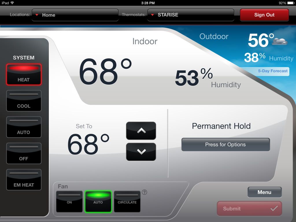 The only drawback to those is if someone ever gets your IP info.......ok I like to play devils advocate  There are cameras where I work. If you have the IP address you can go to it from any computer anywhere in the world. Herb, I think thats the right way to go.Some people are afraid no matter what. I am still considering a few cameras but I admit I don't put a lot of faith in them. Mine would be well hidden. If you come to my house I promise there won't be any in the bathroom. Guess what else you can do remotely? Here is screenshot of my ipad. This is my home thermostat. I don't pay a monthy fee for this. When I put in my heat pump last week I added a redlink thermostat. The ipad goes to a honeywell server and can look through wifi at my thermostat. The thermostat itself is much more complex than this, but this free app lets me adjust temps, set schedules, look at outdoor/indoor temps and humidities.