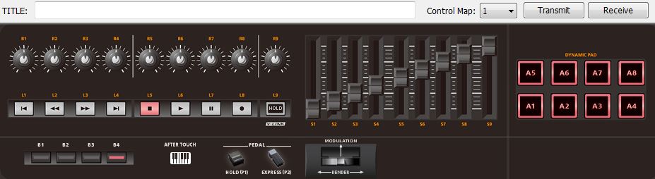 Therefore, I have programmed my A500pro with the editor to set up CC outputs that are common to several of my synths.  For example, the knobs and sliders control filter cutoff frequencies, filter resonances, ADSR decay parameters, LFO speeds, etc.  I have the pads programmed to hit notes 36 through 43 for use with drum machine software VSTs. All of this is programmed on Control Map 1.