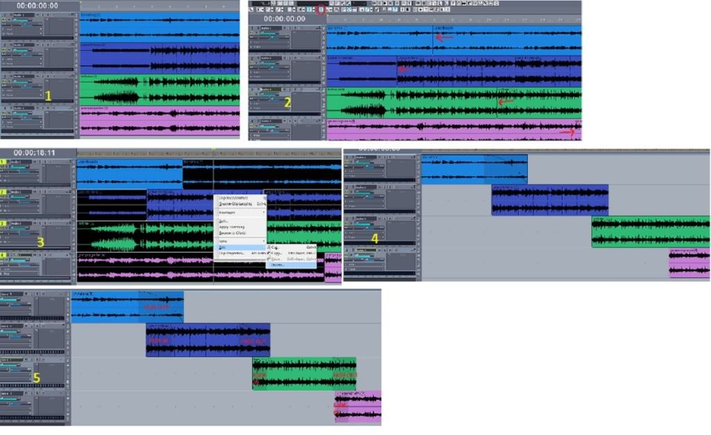 In this image, you can see that I imported 4 songs (1), used the Split tool to seperate the clips in the tracks into smaller clips (2).
