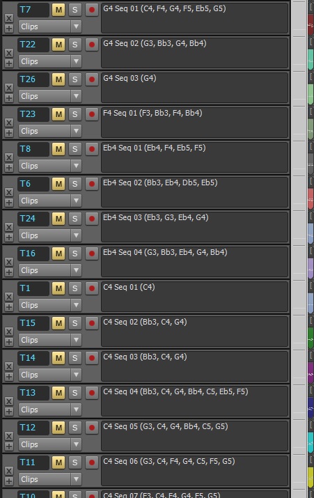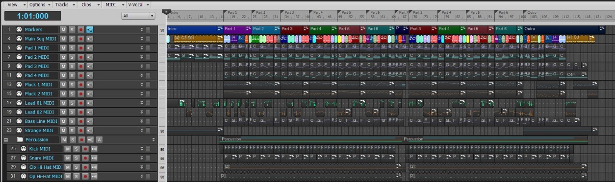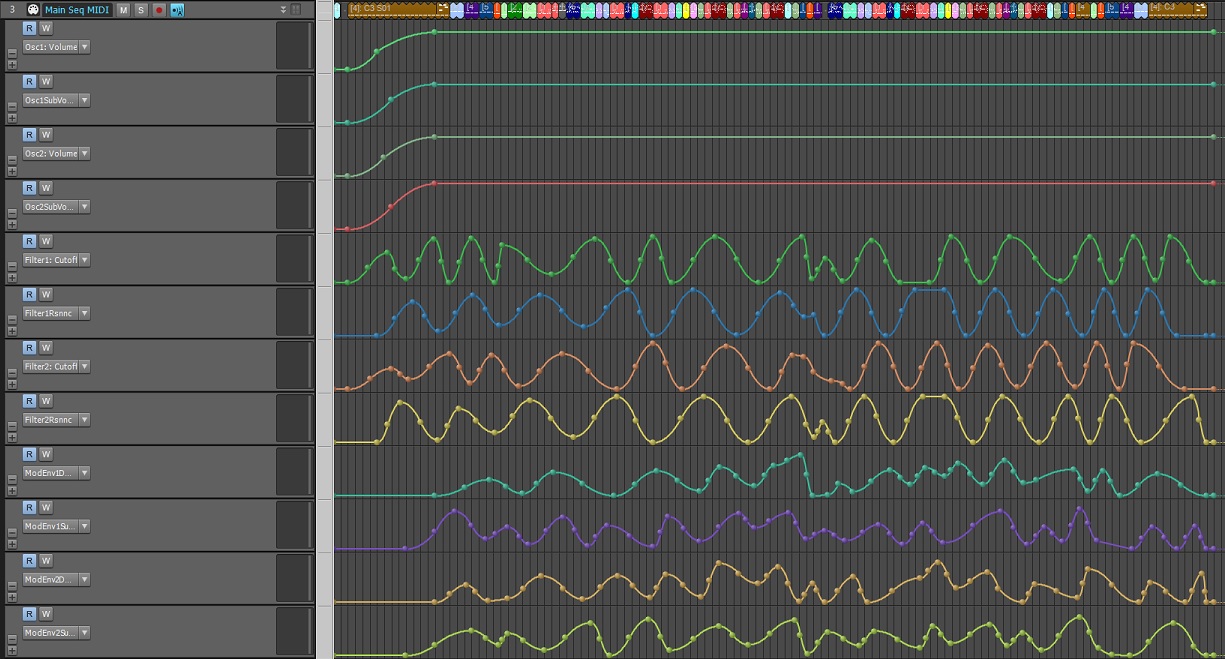 Creating Nessus pt 1 Okay, I'm going to try and give a detailed breakdown of my latest track, as much for my own benefit, as well as giving peeps an insight into my music. It was seven days ago when I saw a post about Hive, the latest release from u-he. It's a VA soft synth and I gave it a quick go and thought, "I'm having that." There are plenty of "one synth" demo's out there, but felt I wanted to give it a go. I normally get bogged down in an eight/sixteen bar idea that goes nowhere. Somehow I managed to break that with this composition. This time I started mapping out a bit of a "structure," by playing with a few different chords. It only took me about three days to map out the whole tune, pretty much. Might sound like a long time but I can take ages with his process. For the chords I used two different pad sounds from Hive's presets, one panned 60% right and the other 60% left. I wanted an evolving sequence running through the whole track, so I used X2's Step Sequencer for that, producing, in total, 23 different sequences based around the different chords, each just one bar long. I "stored" each sequence in its own Take Lane which was then muted. I do this so that I can make notes on each sequence and copy them around as needed. So now I've got my chords and main sequence running through the track. I wanted a percussion section next. Hive isn't multi-timbral, so I had to use an instance of Hive for each item. I went with just four; kick, snare, open and closed hi-hat. I then stuck those tracks in a folder. I mapped out a very simple quarter note pattern on the kick and a simple complement on the snare. The hi-hat is simple too, just a 1/16 pattern. I used velocity at this time to give the percussion some sort of feel. Then I added a bass line, following the tonic of chords, with no complexity whatsoever, varying the length of notes played, nothing else. I then created two more pad tracks, this time panning 80% L/R. The notes played are mainly an arpeggio of the main chords sequence, each track slightly different. Now, although I didn't really need them, I created two more sequence type tracks. These are panned hard L/R this time and are fast attack short release presets played in the upper register. These vary and interweave throughout the main body of the piece. Then came the lead parts. I knew I wanted two, but to start with I placed one instance of Hive, selected a typical synth lead preset and played a load of takes over the top of my backing. I knew these would need some heavy post processing. I've been playing keys for a long time, but I'm still rubbish. And limited in my style too, hence the pentatonic scale used. It was this process that probably took the longest as I had to painstakingly go over each bar and tweak notes back into time. I don't use quantize on lead tracks as I feel that this is the only part of my music that should not sound mechanical and computerised. I drag each note to within a 1/128th off the beat, give or take, which is hopefully enough to make the lead track sound like it has been played by a human. That can play keyboards... Once I finally got the lead part sussed, I loaded another instance of Hive and selected a different lead preset. The MIDI from the first lead track was copied to this. I then had to decide how these two lead part would interact, kind of talking to each other. I split at points I thought felt good and muted one track. This was done throughout the lead tracks and I ended up tweaking/adding notes as I went along. In a couple of places the two lead tracks play in tandem. Next up was to revisit the main sequence. I said that I wanted it to "evolve" and to that end I used automation envelopes. Twelve in all. One on each of three oscillator and sub osc volume controls, four in total. One on the cutoff and resonance of the two filter ADSR mods, another four. And the final four where for the delay and sustain levels of the ADSR mods. I could have used automation on the track volume but I wanted to see how using the Hive oscillator volume controls sounded. Here is a screenshot of the envelope lanes:- This was another lengthy process. I think Sonar could use some improvement when it comes to creating and editing envelopes (assuming there is no change between X2 and Platinum). Finally, I decided that I wanted to add a sort of "effect" type track. So I added a final instance of Hive and tried a number of presets before I arrived at something I thought was suitable. It is used in the intro and outro sections only. So, here's my final track view layout:- Notice how I hide the "instrument" tracks, leaving just the MIDI tracks. I never look at levels in track view and leave that for console view, which is better suited in my opinion. Also, as well as placing markers to show each section I also use a dummy MIDI track that I place clips on with different colours so that it's easier to see, as well as easier to select sections of the song to loop or edit. Okay... I will cover the mixing and mastering stages in another post.