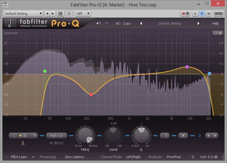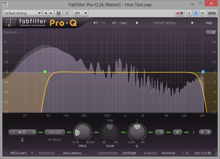 Creating Nessus pt 2 Now for the mixing and mastering stage... I'm far from being a "pro" mixing engineer, obviously, and I'm totally self taught, with help from a lot of offline and online media, including this great forum. As a result, my workflow isn't the best, but it's all I know. I tend to mix as I'm going along, tweaking levels as I add new elements. At some point I sometimes drop all the faders down to zero and start from scratch, and this is what I did here. I first brought up the percussion as high as it would go and then everything else was brought in around that. I believe that sometimes percussion can get lost in the mix so I try to give it some priority. Doesn't always work though... Regarding effects... I wanted to use all of the effects within Hive, and for things like reverb, delay, chorus and distortion I did. But I found the EQ and compression effects to be not that great... More to do with my limitations I guess, as I have now become to love my FalbFilter effects. Ease of use and great user interface are the main reasons. And I like the spectrum analyser, which is essential for me because I mix on headphones and I need to know what is happening at below 50Hz. I did try to stick with just one instance of Pro-Q on the master bus only, but after a while I started adding Pro-Q into the effects bins of individual tracks too. It was then that I noticed that there was some low end stuff hanging around in some of the presets. This is Pro-Q showing the spectrum for the main sequence:- Notice the slight increase in low end fequencies below 50Hz. I know they are only at around -45dB but I always worry that this will all add up to problems later. So, as you can see, I added a "low cut" at 50Hz in this case. Same again for one of my pad presets:- And here's the snare, although this time I decided to cut at just over 100Hz:- I therefore went through all of my tracks to check this out. Not all the tracks suffered... But those that did received some serious bass cut. On the master bus the Pro-Q instance has some more low cut. But here is my problem, I think, which is mentioned above. Notice how much low frequency stuff is still there:- A clear illustration that I still have a lot to learn yet... But the lack of any real EQ adjustment on the master bus was more of a "keeping processing to a minimum" sort of thing. But now that it has been mentioned I need to ad some more curve that that EQ, perhaps something like this:- I must admit, that even in my headphones, it sounds less "boomier" already, so this must be a step in the right direction. Comments invited as usual Okay, now for the limiter... I created a topic about this subject in the Techniques forum and there is plenty of help in that. But I am still opting to go down the limiter route rather than killing the peaks before they get to the master bus. The main reason for this is, I do not freeze my synths, because my laptop has the power for most of my work, and I therefore have no waveforms to go by. And, as I find with the synths I use, once you start tweaking filter resonance and cutoff you can get unexpected peaks here and there. I deal with most of them by altering the fader level, and once upon a time I even added some fader automation to dip a level momentarily. So I'm finding the limiter method a tad easier to deal with those rogue peaks, that are more a product of adding all the tracks together than clipping levels on individual tracks. Here's a Pro-L screenshot:- As you can see, there's not much going into the red there... Notice I had Inter Sample Processing turned on. However, I still had problems with the final export. At first I made the output level -0.2dB and the resulting wave file was fine. But upon converting the file to MP3, it clipped. Not by much, but a clip is a clip. I eventually had to drop the output to -0.4dB to remedy this. Finally, here's my waveform for the entire tune:- Even though the wave is quite busy, there is still some dynamics in there, and I am reasonably pleased with the final result, other than the low end problems mentioned. I am still using Sound Forge 10 for manipulating my final wave file and converting it to a 320kbps MP3 file. Lately, "manipulating" consists of trimming the track to length, if needed, and inserting a bit of silence at the beginning and end. I would normally have compressed the wave too, but in this instance I was happy with the levels that I exported from X2, as a result of using Pro-L on the master bus... Something I have not done until recently. Okay, I think I've waffled on for long enough about this now. If you made it this far, thanks for reading cheers andy