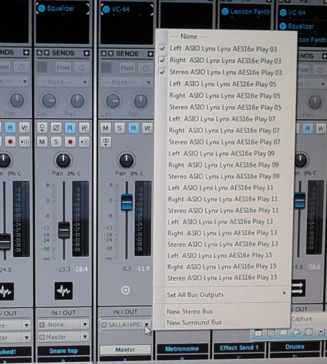 Just a note, I just looked on my laptop which shows Timing Master as Tascam 03. Not 01 ,, but it works fine. So that's not the problem. And my Master output bus has Tascam 01 , Tascam 03 or Tascam SPDIF as output option. The Tascam has 16 ins and only 4 outs plus SDIF. Yours seems to have 16 outs ..correct? But your terms posted: AES16e Play 01, Right ASIO Lynx Lynx AES16e Play 01, or Stereo ASIO Lynx Lynx AES16e Play 01. Seem like your looking at inputs and not outputs or something strange. But I guess each driver dispalys differently. Mine just says a very short group of words as I've made bold above. The same goes for my Scarlett which I think say's Focusrite Mon 1. etc. Anyhow just something to ponder. I just find it weird that if the Sound cards 01 outputs shows in the Audio options/ Advanced output list that it would not show as an output for a Bus, that's almost imposible.