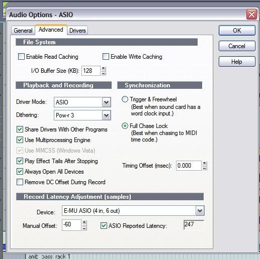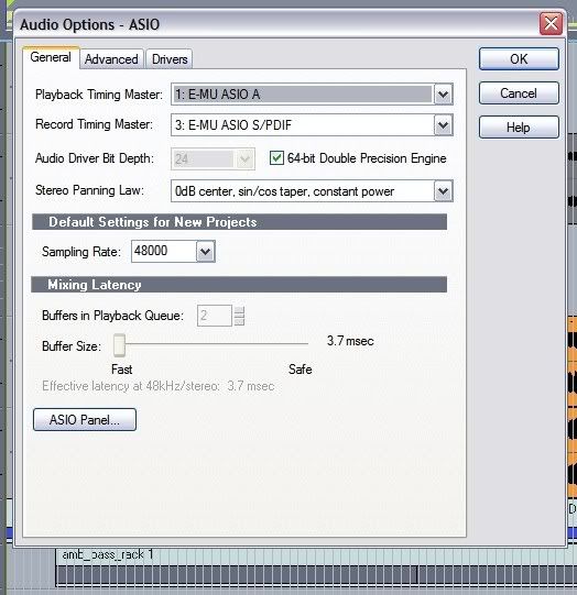 I'm ASIO drivers and E-MU ASIO 1/2 is the "Playback Timing Master" In WDM it's the E-DSP Wave. In WDM mode it records/plays back and the "Now Time" and progress bar work fine. In ASIO mode I can record/Play back but "Now Time" and Progress bar stop after about 1 beat. Just 0404 pci is installed. Should not the E-DSP wave show up in the Properties of the Sound system as a Recording device? It doesn't show up in mine however I am able to record audio through my S/PDIF using my Boss GT-8 guitar processor. I"m using Vista by the way! Thanks for your quick response. Mark