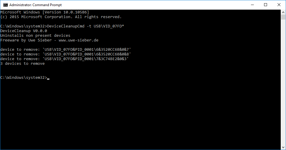 - Test your patterns by executing Devicecleanupcmd with the "-t" (test mode) option. Consult the documentation and refine your patterns until a single command locates all of the relevant "non-present devices" with no false positives.