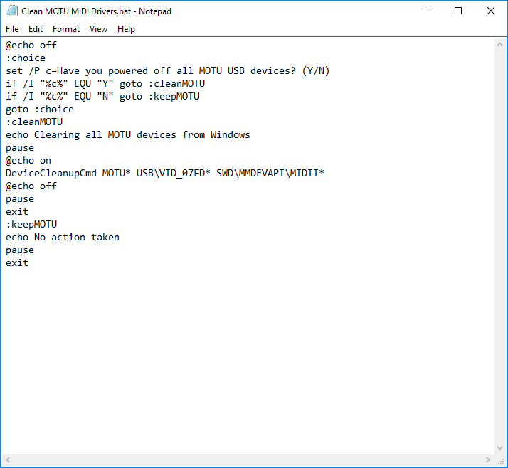 - Embellish your batch file as desired. In my example, below, I've added prompts to verify that all MIDI interfaces are powered off. [Otherwise, the process won't be successful.] If you've got a lot of interfaces or are otherwise forgetful, you might also want to remind yourself in which exact order the devices should be re-powered up.