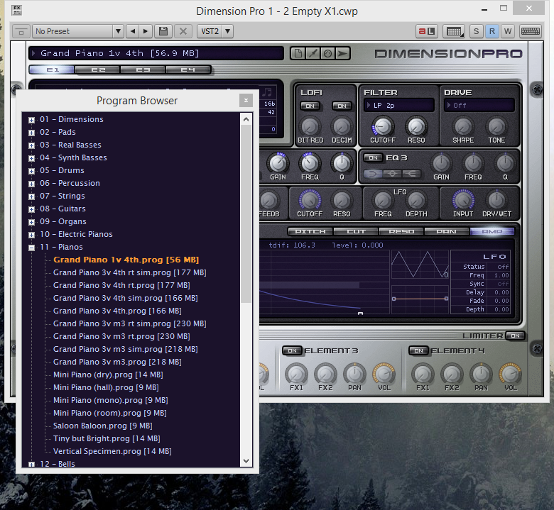 scook:  When I opened DimPro, I selected an acoustic bass patch.  (If I maximize the DimPro window, the patch (Full Acoustic) is displayed in the "Program Browser" field.
