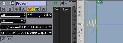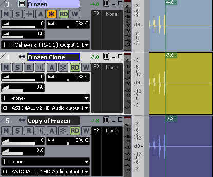 bitflipper More strangeness. I drag-copied the frozen track (which peaks at -4.8db) into another track. Surprise: the copy peaks at -7.8db! Then I cloned the frozen track, and it too peaked at -7.8db. So here I have three tracks: one original and two ostensibly "identical" copies. The original frozen track peaks 3db higher than either of the two copies. Finally, I changed the track interleave on the frozen track to stereo (with the track still frozen) and - ta da! - it now peaks at -7.8db. This suggests that the problem isn't in the freezing, but in the PLAYBACK of the frozen track. This at least gives me a little nicer workaround: freeze the track normally but then set the track interleave to stereo to get the proper level on playback. oh man, I don't think I would have ever thought to try that. thanks for reporting that bit, very good info.