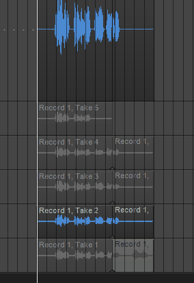 When you record in Comp Recording mode (right-click the record button for options), SONAR will automatically mute each previous take as a new one is started. When you stop the transport, it will split all takes at the end of the overlap, and leave any part of the previous take that isn't overlapped unmuted so that the two takes constitute a complete "comped" take.
