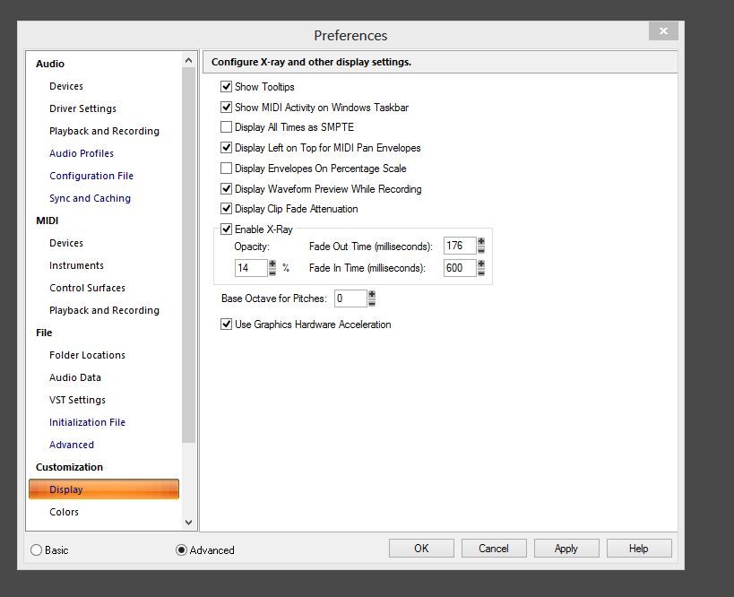 TS "I still can't find it in Sonar. I'm opening up Sonar, hitting 'P' to bring up 'Preferences', scrolling down to where it says 'Display', and I see nothing there that says 'Graphics Hardware Acceleration' or anything close to that. I see options to turn X-Ray on/off and other display related options, but nothing to do with 'Acceleration" I think it is not a Sonar Parameter, but a parameter of the OS (Windows) ; but i couldn't find it, anyway (though it reminds me something...). Edit>Preferences>Customization>Display there is a check box - it is the last setting displayed in the dialog box. The text of it reads: ' Use Graphics Hardware Acceleration". It is right below the option that says: 'Base Octave for Pitches'. Bob Bone