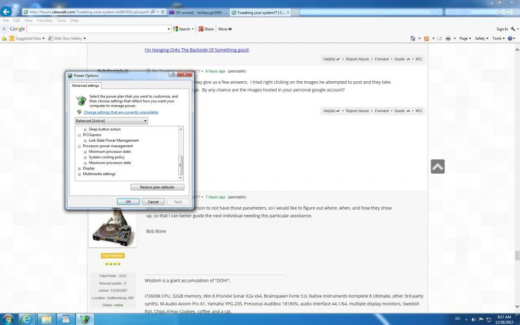 FANTASTIC news! @Alex, after Sir Les had reported from a prior thread that he did not have the Processor Power Management (where the Minimum Processor State and Maximum Processor State are found), I went to a Windows 7 machine I used to use as my primary DAW, and it was also labelled the same as it is for me in Windows 8. I am wondering if that naming difference is something in one of the multiple flavors of Windows 7 (Home, Premium, Professional, Ultimate, Super Duper, New and Improved, Wowzer Dowzer). - I don't recall what the flavors were called - please forgive me for substituting drivel. The point is that perhaps its name varies among Windows 7 versions, and that is why Sir Les did not have it under the name I gave him, and perhaps why it is under the name Alex has supplied. Bob Bone