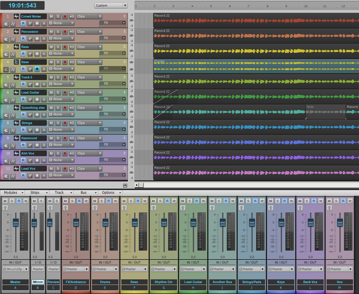 stickman393 .......You've got frozen tracks; muted clips; clips not in solo'd tracks; regionFX clips; selected areas of clips... there's just so many subtle color hints that ideally need to work together to convey meaning to the user - especially new users. (emphasis added) It's so easy to screw that up by color customization. Also, you've got the "track follows bus color" feature that is pretty nice.