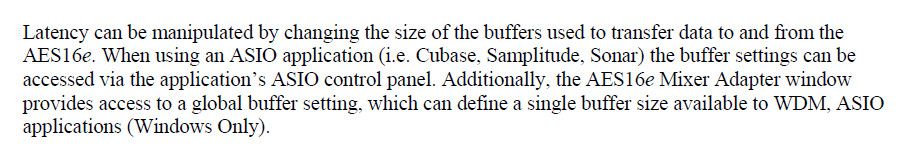 Thanks for explaining why the controls aren't available, Scook. There is no way to set the latency from the Aurora 16 or the AES16e card other than a single global setting, set it and forget it. I need to go through Sonar to change the buffer sizes for each project.