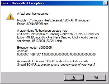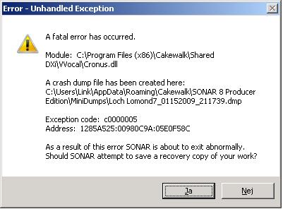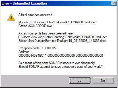So maybe - just maybe this is NOT a plugin error. Maybe it is true. The error message (in previous post) explicitly says: A fatal error in module SONARPDR.exe so maybe there in fact is a fatal error in module SONARPDR.exe....
